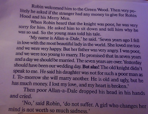 "Меня зовут Аллан-а-Дэйл. - сказал он, - Семь лет назад я влюбился в самую прекрасную девушку на земле. Она меня тоже любила и мы были так счастливы. Но ее отец был очень зол. Я был беден, и мы с ней были слишком молоды для брака. Ее отец обещал, что через семь лет и один день мы с ней поженимся. Семь лет истекли. Вчера должна была состояться наша свадьба. Но увы! Ее отец не стал со мной разговаривать. Он лишь ответил, что его дочь не должна быть с таким бедняком, как я. А завтра она выходит замуж за другого. Ее жених стар, некрасив, но очень богат. Я потерял свою любовь и теперь мое сердце разбито."
