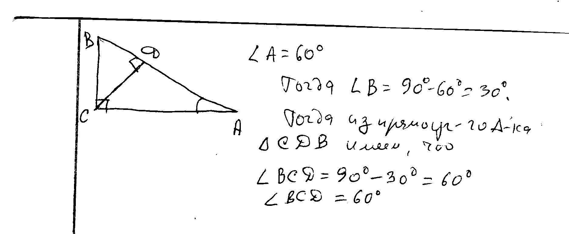 В прямоугольном треугольнике ABC из вершины прямого угла C проведена высота CD. Найдите угол BCD, если угол A равен 60 градусов.