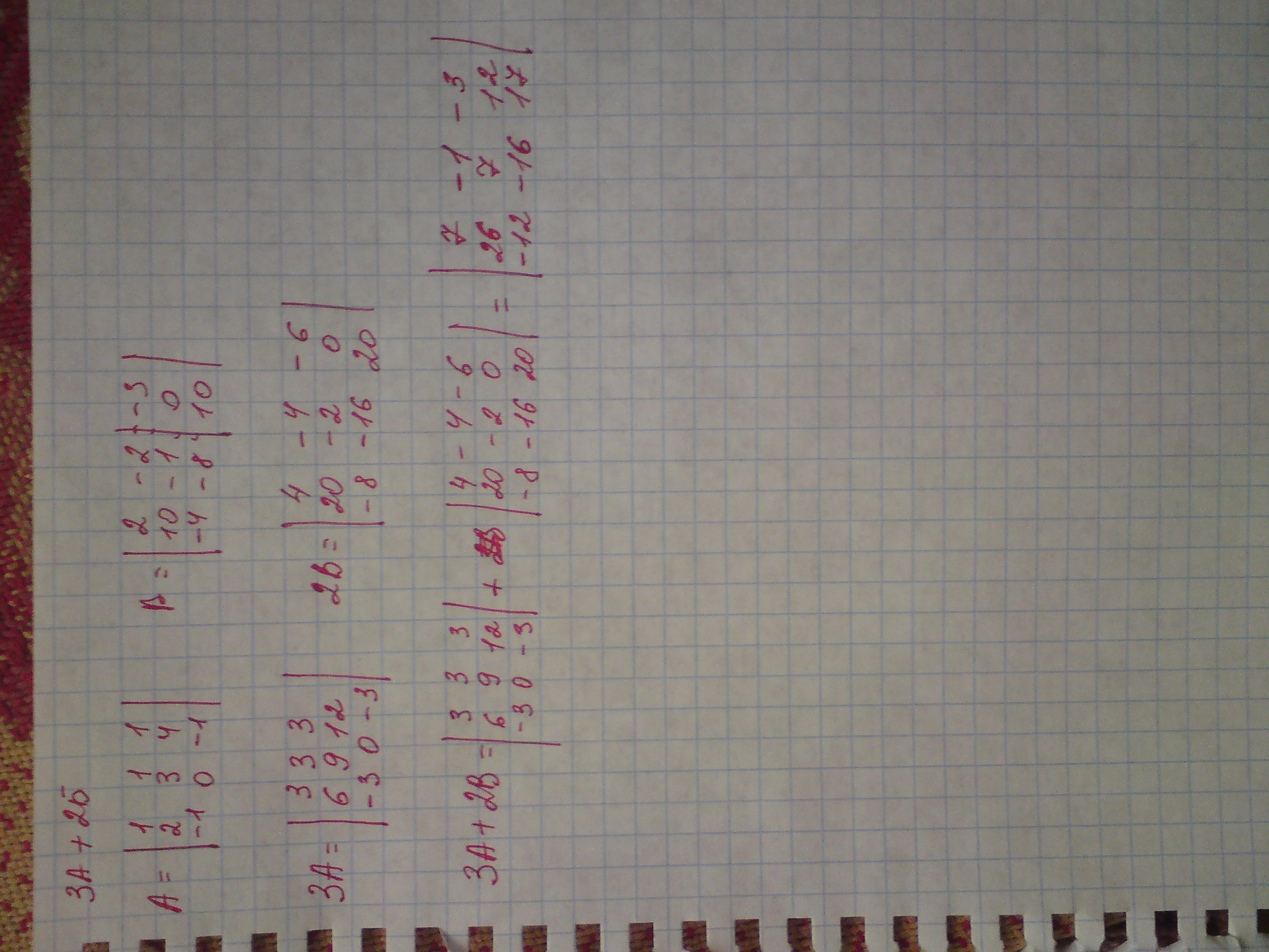 Вычислить линейную комбинацию матриц 3А +2Б матрица А первый столбец 1;2 ;-1 второй столбец 1;3;0 третий столбец 1;4;-1 матрица В первый столбец 2;10;-4 второй столбец - 2;-1;-8 третий столбец - 3;0;10