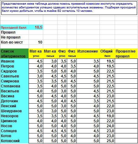 Представленная ниже таблица должна помочь приемной комиссии института определить количество абитуриентов успешно сдавших вступительные экзамены. Подбирая проходной балл нужно добиться, чтобы в ячейке В2 осталось 10 человек.