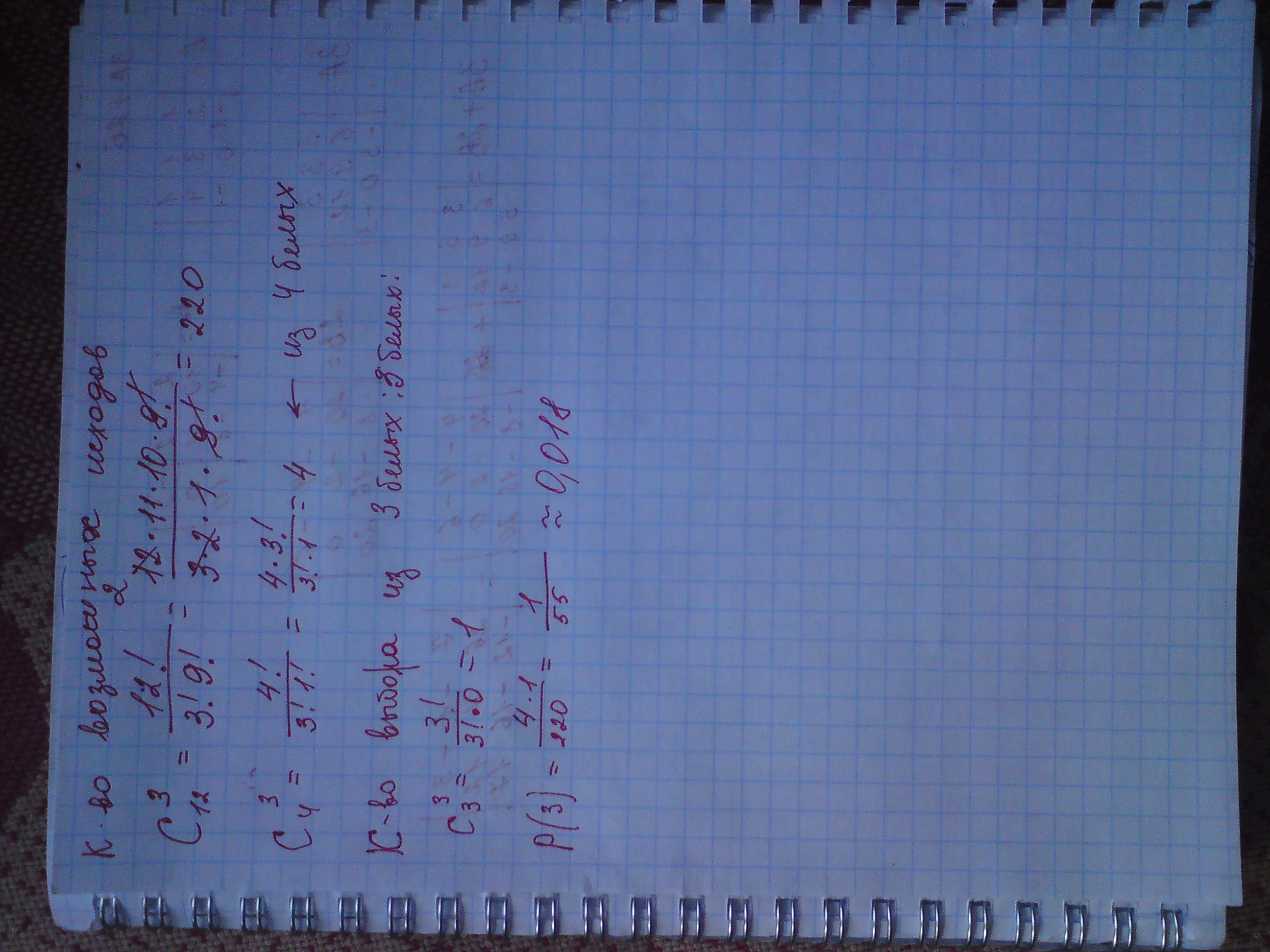 В урне содержится 12 шаров: четыре белых и восемь черных. Наугад вынимают три шарика. Какова вероятность, что среди вынутых шаров все три-белые?