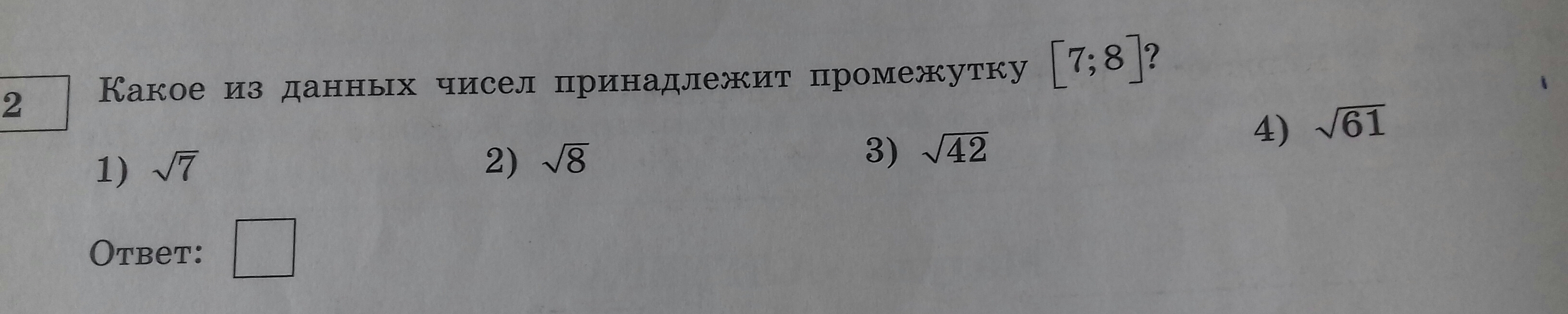 Возведи в квадрат концы данного промежутка, то есть 7 и 8. 7*7=49 8*8=64. то есть находишь те числа которые принадлежать данному промежутку. sqrt49<x<sqrt64. х=sqrt61 Ответ: sqrt64. P.s. SQRT- квадратный корень (на языке программирования)