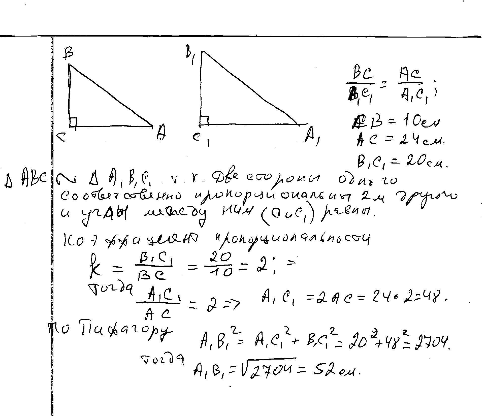 Катети прямокутного трикутника завдовжки 10см і 24см відповідно пропорційні катетам іншого прямокутного трикутника. Знайдіть гіпотенузу другого трикутника якщо його менший катет дорінює 20см