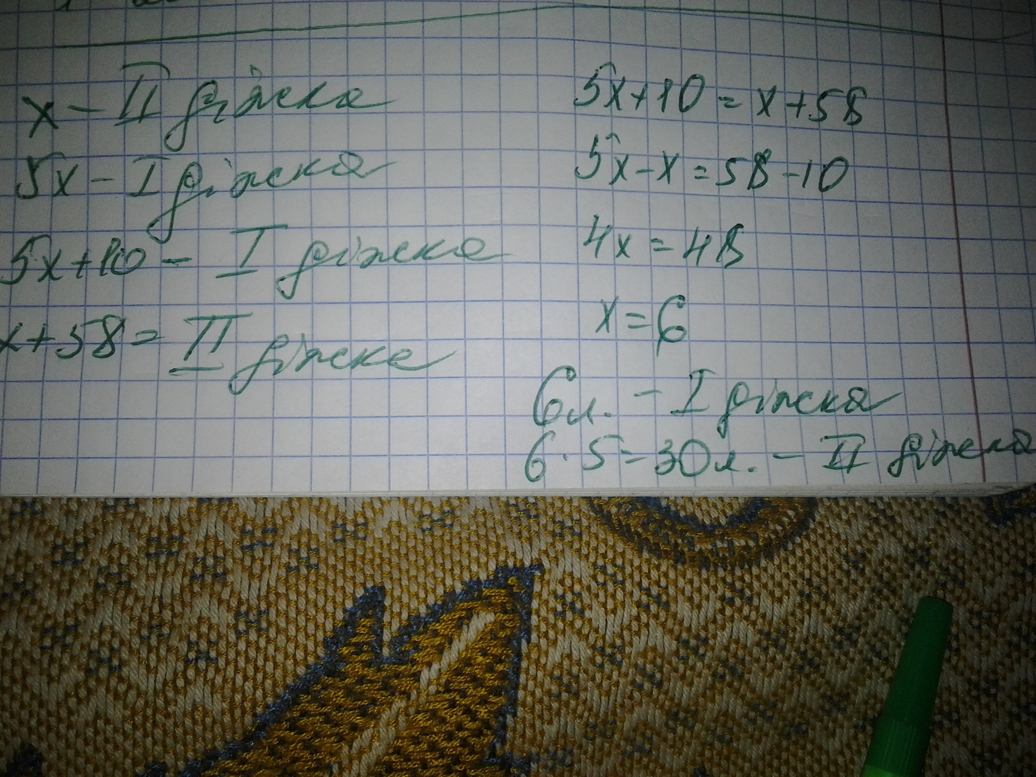 В одній діжці було у 5 разів більше води ніж у другій. Коли у першу діжку долили 10 літрів, а у другу діжку 58 літрів, то стало порівну. Скільки було спочатку?
