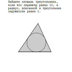 Найдите площадь треугольника, если его периметр равен 10, а радиус вписанной окружности 1