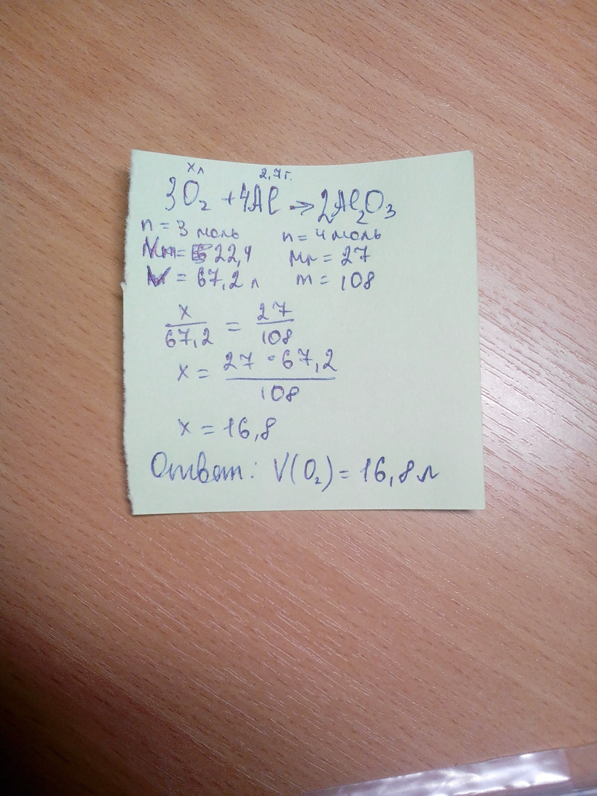 V(O2) = 2,7 * 67,2 / 108 = 1,68 л