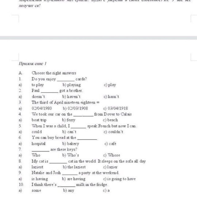 1) a 2)c 3)с 4)b 5)b 6)b 7)c 8)a 9)b 10)b