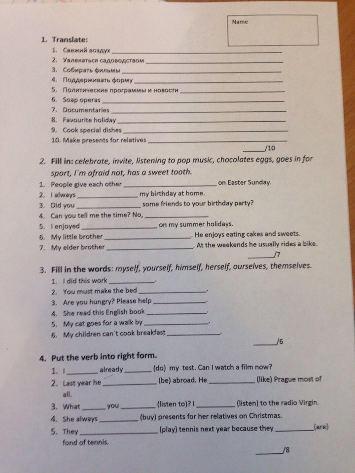 1 chocolate eggs 2)celebrate 3) invite 4) i'm afraid not 5)goes in for sport 6) has a sweet tooth 7)listening to pop music