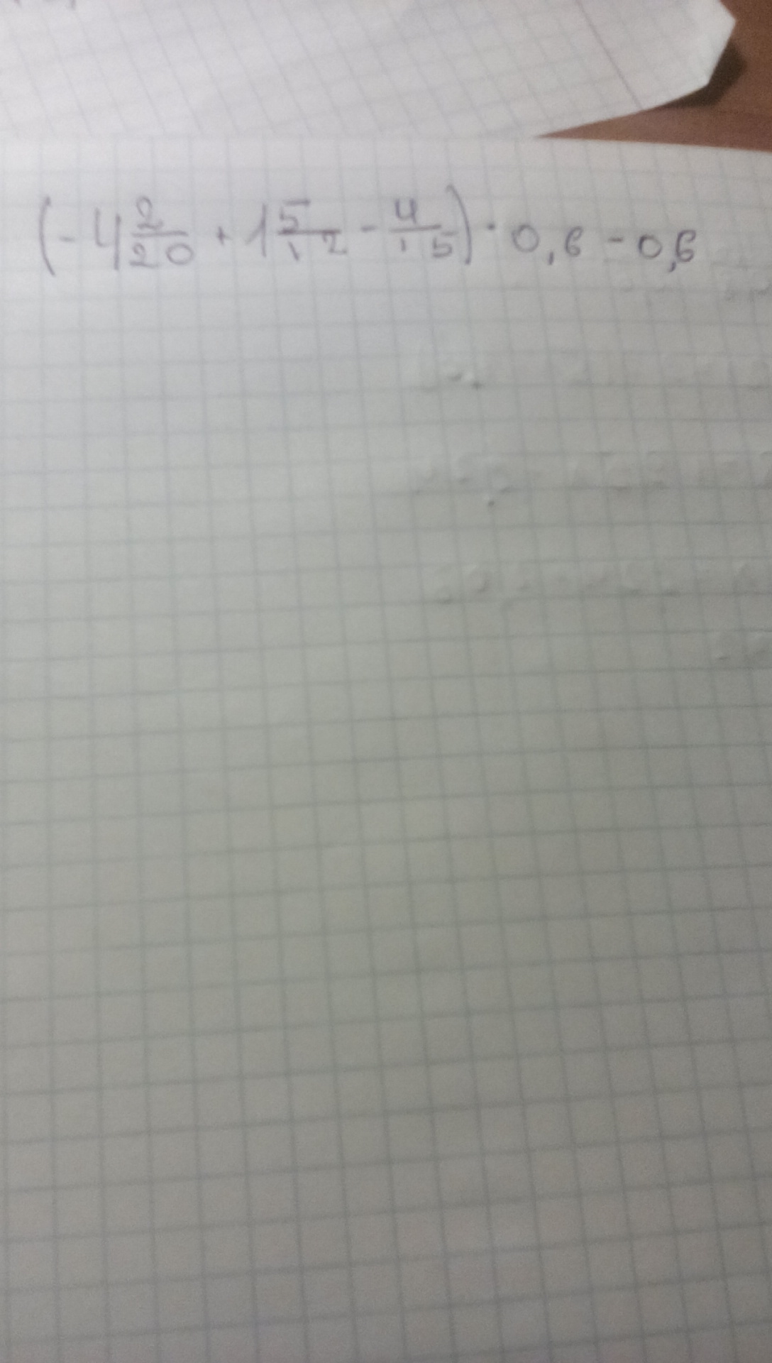 (- 4 2/20 + 1 5/12 - 4/15) * 0,6 - 0,6 = (- 4 6/60 + 1 25/60 - 16/60) * 0,6 - 0,6 = (- 4 6/60 + 9/60) * 0,6 - 0,6 = - 2 57/60 * 0,6 - 0,6 = - 177/60 * 6/10 - 0,6 = - 177/100 - 6/10 = - 1,77 - 0,6 = - 2,37. Ответ: - 2,37.