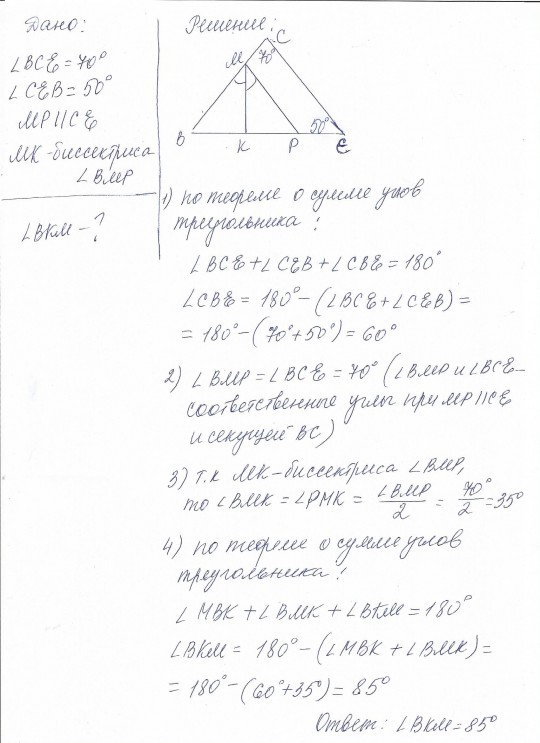 2) по свойству накрест лежащих углов при пересечении параллельных прямыс секущей: угол MKP=E=50гр.