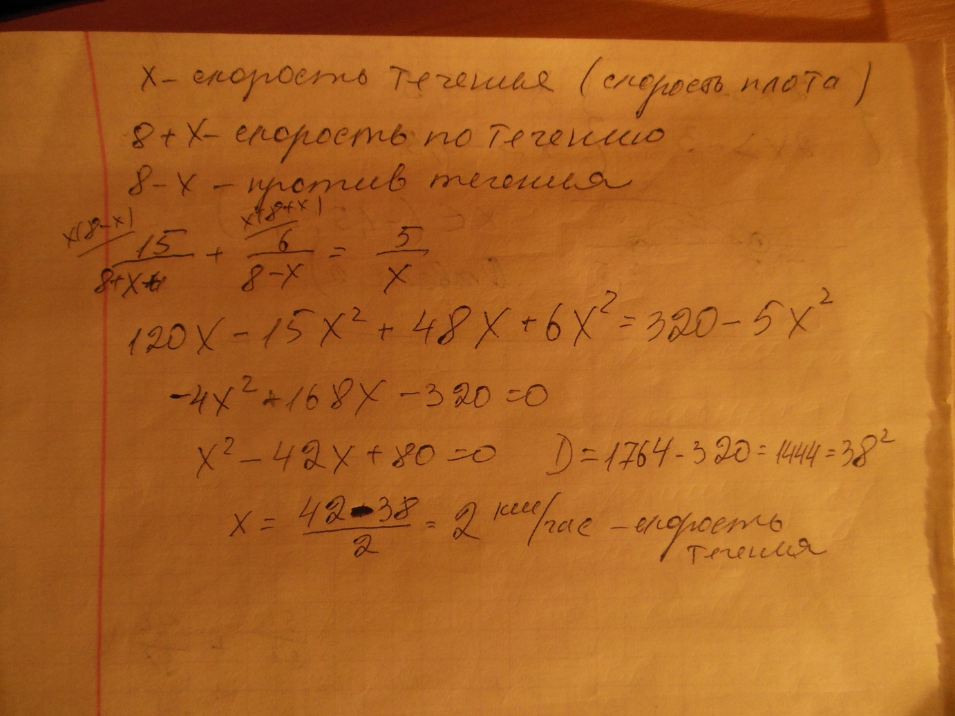 тогда скорость лодки по течению (8+х) км/ч, а против течения (8-х) км/ч