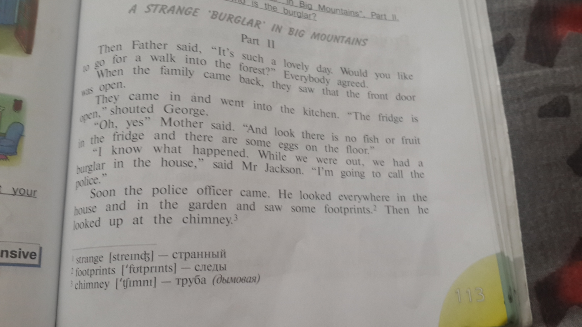 Вскоре приехал полицейский . Он осмотрел весь дом и сад и увидел некоторые следы. Тогда он посмотрел в дымоход.