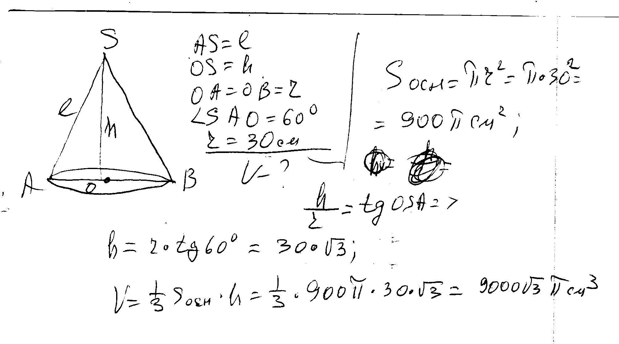 Угол между образующей и плоскостью основания конуса 60 градусов . радиус его основания 30 градусов . вычисдите объём конуса