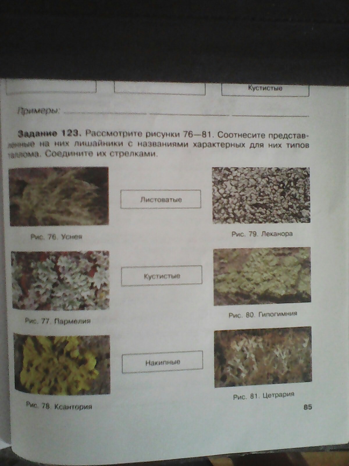 Рассмотрите рисунки 76-81. Соотнисите представленные на них лишайники с названиями характерными для них типов таллома. Соедините стрелками.