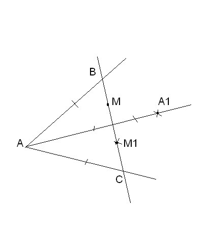 прямая ММ1 перпендикулярна АА1 и точки В и С - пересечения с углом А образуют равнобедренный треугольник АВС с основанием ВС которому принадлежит т. М.