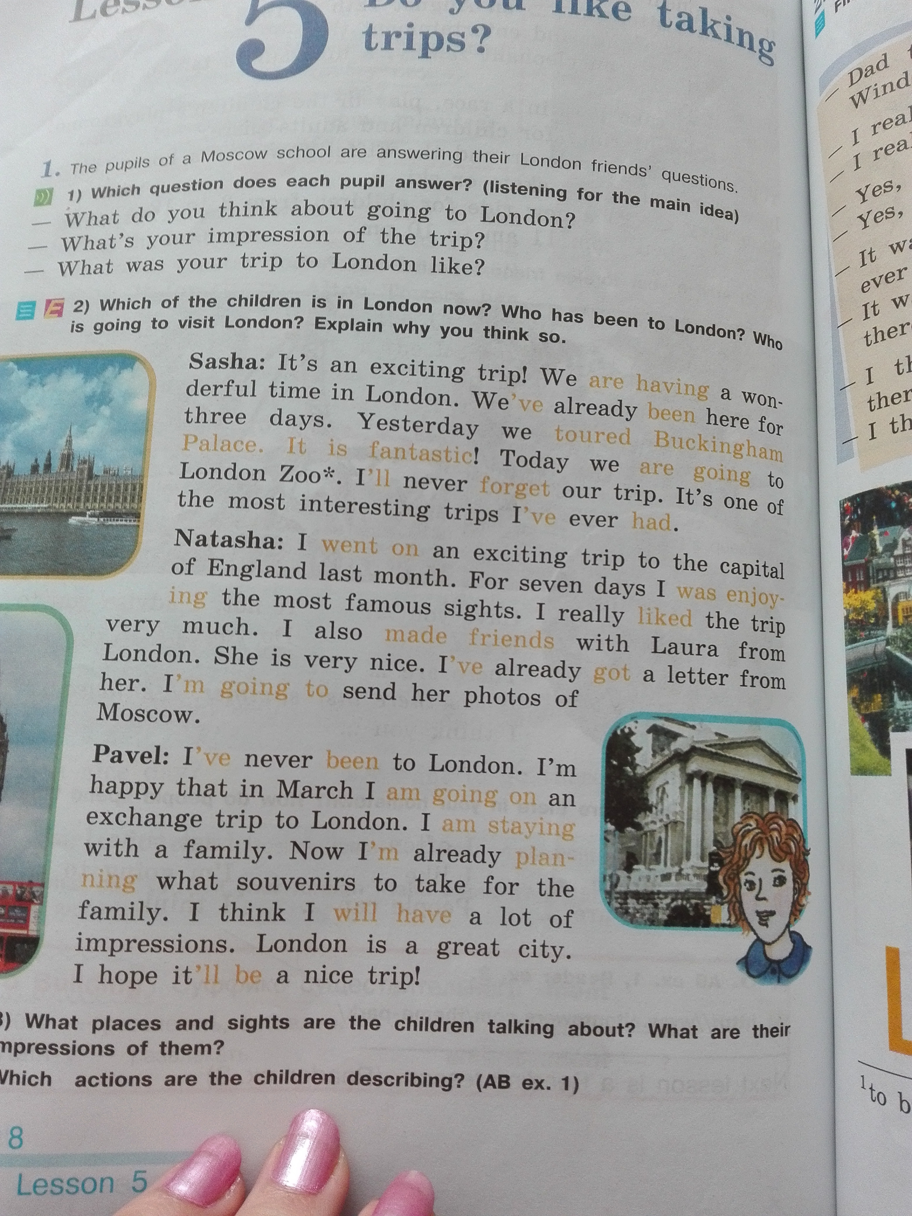 Саша: Это увлекательное путешествие! Мы чудесно провели время в Лондоне. Мы были здесь в течение трех дней. Вчера мы посмотрели Букингемский Дворец. - Это просто фантастика! Сегодня мы отправляемся в Лондонский зоопарк. Я никогда не забуду нашу поездку. Это одна из самых интересных поездок, которая когда-либо была.
