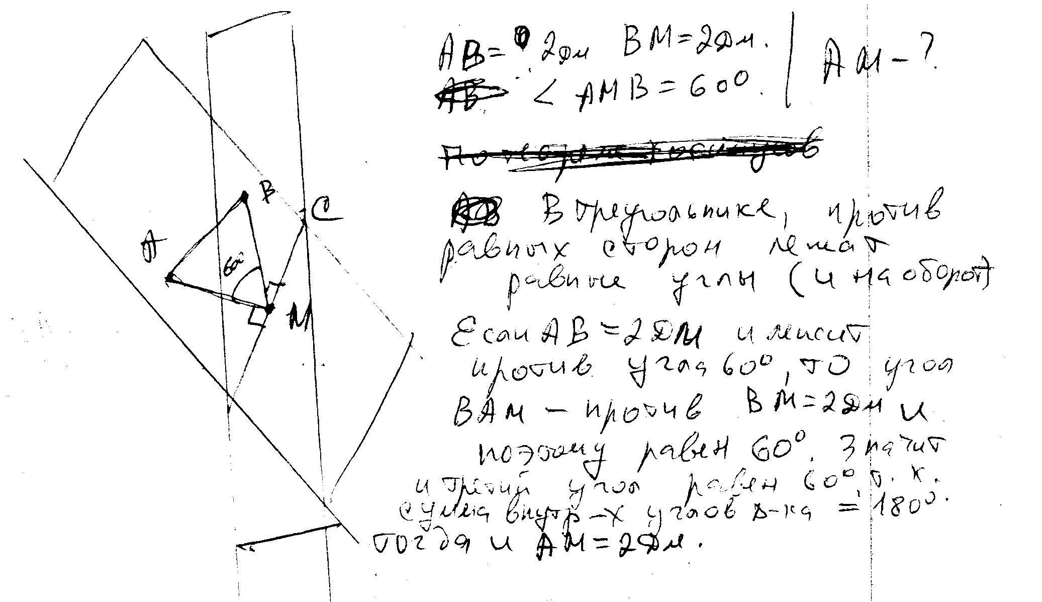 Срочноо!!! Плоскости альфа и бета пересекаются по прямой с. Через точку М, лежащую на прямой с, в данных плоскостях, проведены отрезки АМ и ВМ, перпендикулярные с. Нийдите АМ, если АВ=В= 2 дм, а угол между альфа и бета = 60 градусов