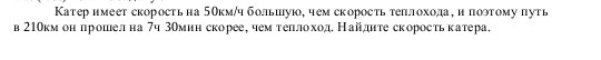 Пусть х км/ч скорость теплохода, тогда (х +50) км/ч скорость ракеты. По условию известно, что ракета прошла 210 км на 7ч 30 мин (= 7,5 ч) бастрее теплохода, получаем уравнение: