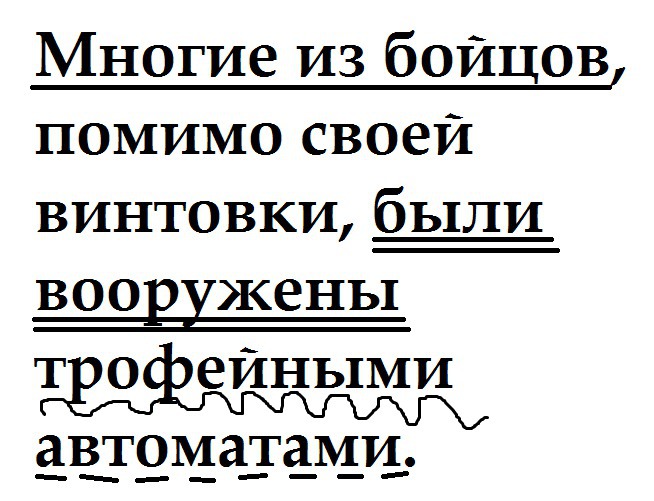 Многие из бойцов помимо своей винтовки были вооружены трофейными автоматами. Выполнить синтаксический разбор, поставить знаки препинания.
