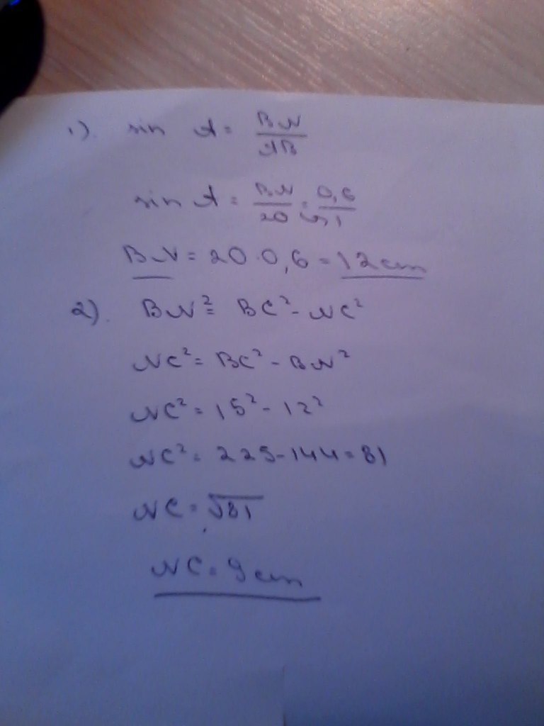 В остром треугольнике АВС проведена высота ВN. Синус угла ВАС =0,6 , длина стороны АВ =20 см , длина ВС=15 см , найти NC ( полное решение )