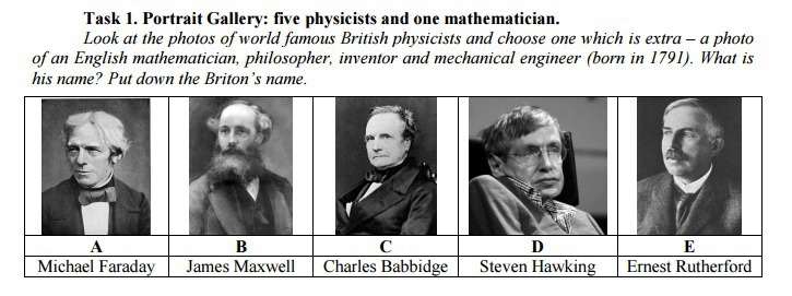 Look at the photos of world famous British physicists and choose one which is extra – a photo of an English mathematician, philosopher, inventor and mechanical engineer (born in 1791). What is his name? Put down the Briton’s name