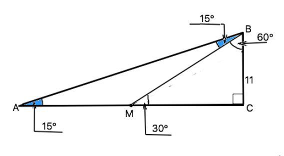 В треугольнике ABC известно, что угол C=90°, угол A=15°, BC=11 см. На катете AC отметили точку M так, что угол BMC=30°. Найдите отрезок AM.