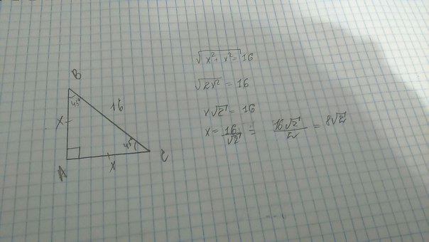 Прямоугольный треугольник АВС(А-прямой), ВС гипотенуза и равна 16см, угол С=45градусов. Найти площадь треугольника