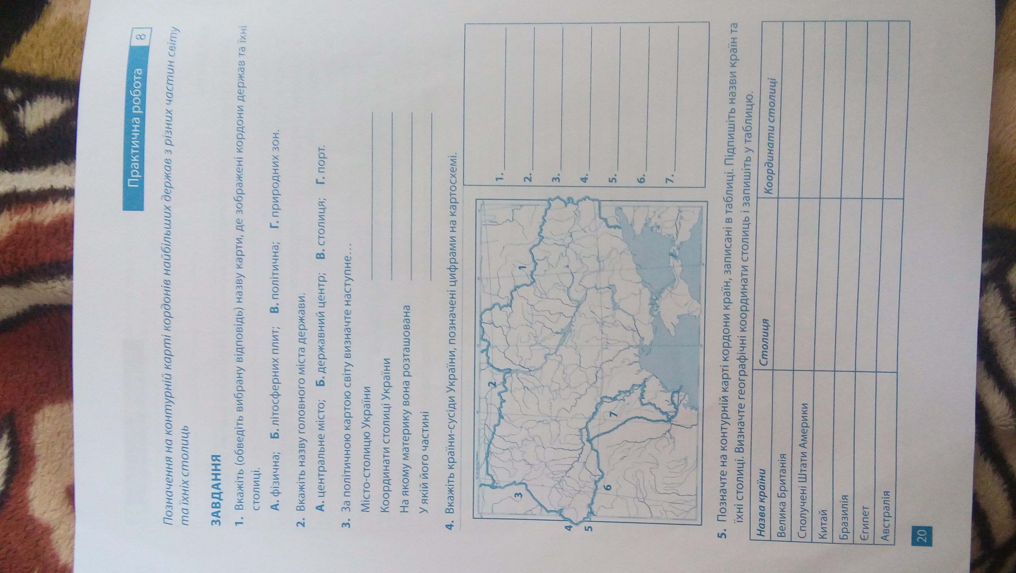 5. Позначте на контурній карті кордони країн, які записані в таблиці. Підпишіть назви країн та їх столиці. Визначте географічні координати столиць і запишіть у таблицю.