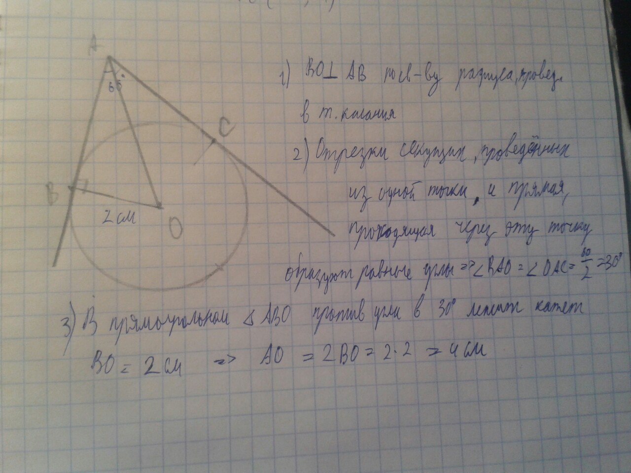 Окружность с центром O касается сторон угла BAC, равного 60 градусам, в точках B и C. Найдите длину отрезка AO. если BO = 2 см