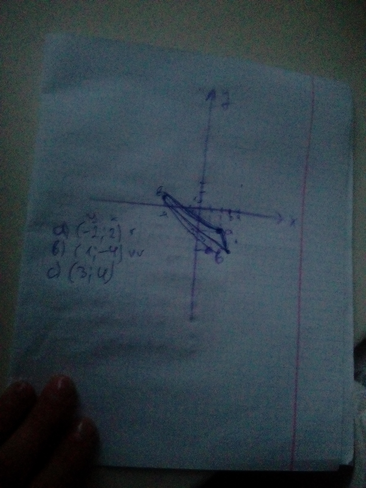 начертите на координатной плоскости треугольник АВС, если а (-2; 2),в(1;-4),с(3;4).Найдите координаты точек пересечения стороны АВ с осью у, и стороны ВС с осью х