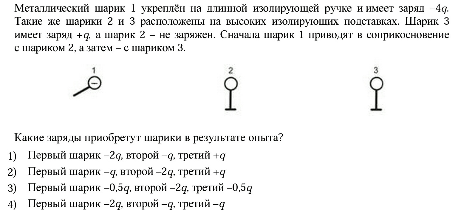 2.Когда второй поднесли к 3, их заряды уравнялись. (-2q+q) / 2 = - 0,5q