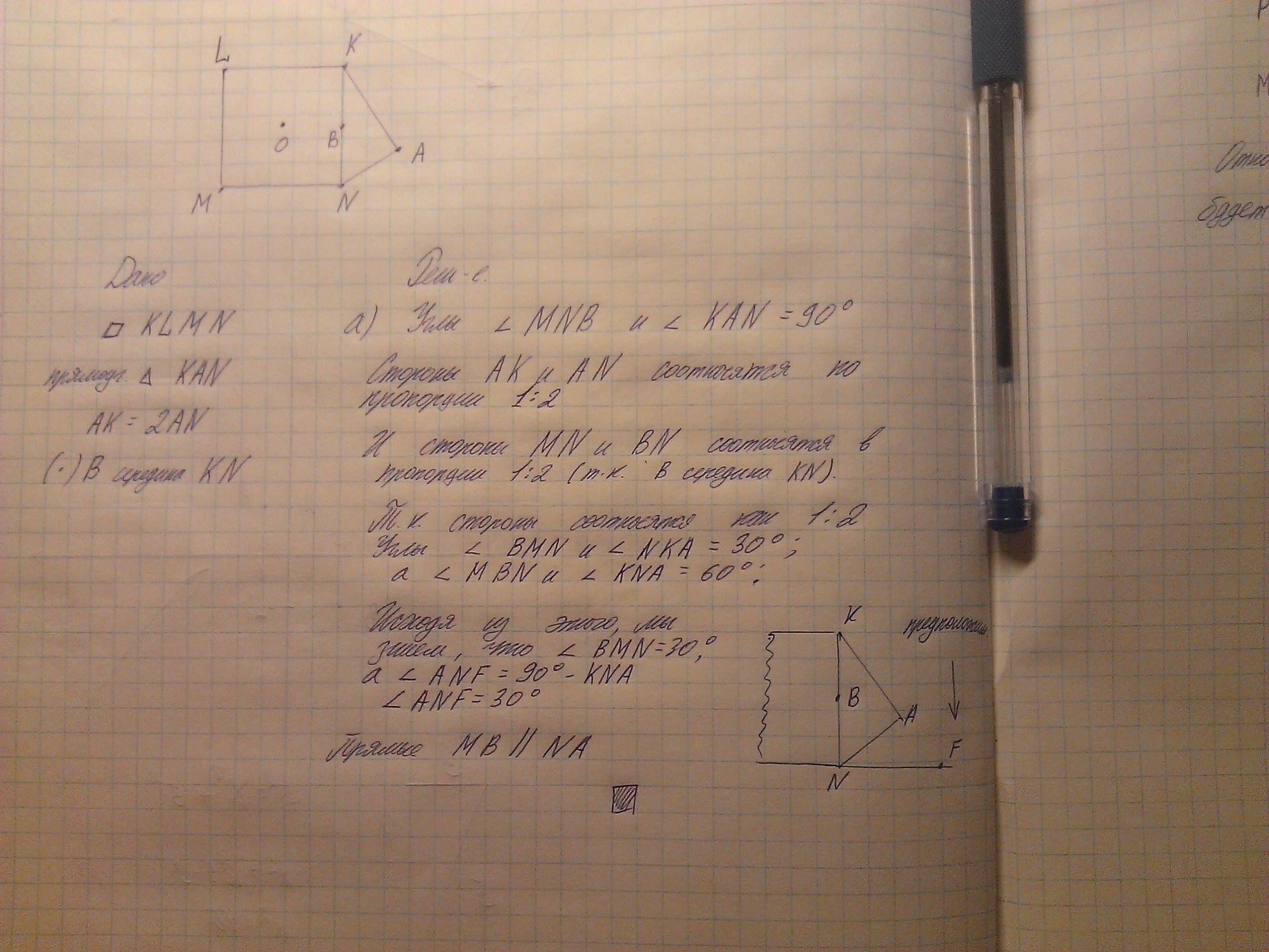 Точка А расположена вне квадрата KLMN с центром О, причем треугольник KAN прямоугольный (∠А=90°) и АK=2АN. Точка В-середина стороны