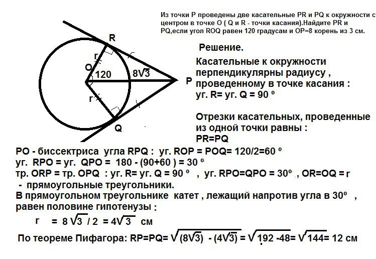Из точки P проведены две касательные PR и PQ к окружности с центром в точке O ( Q и R - точки касания).Найдите PR и PQ,если угол ROQ равен 120 градусам и OP=8 корень из 3 см.