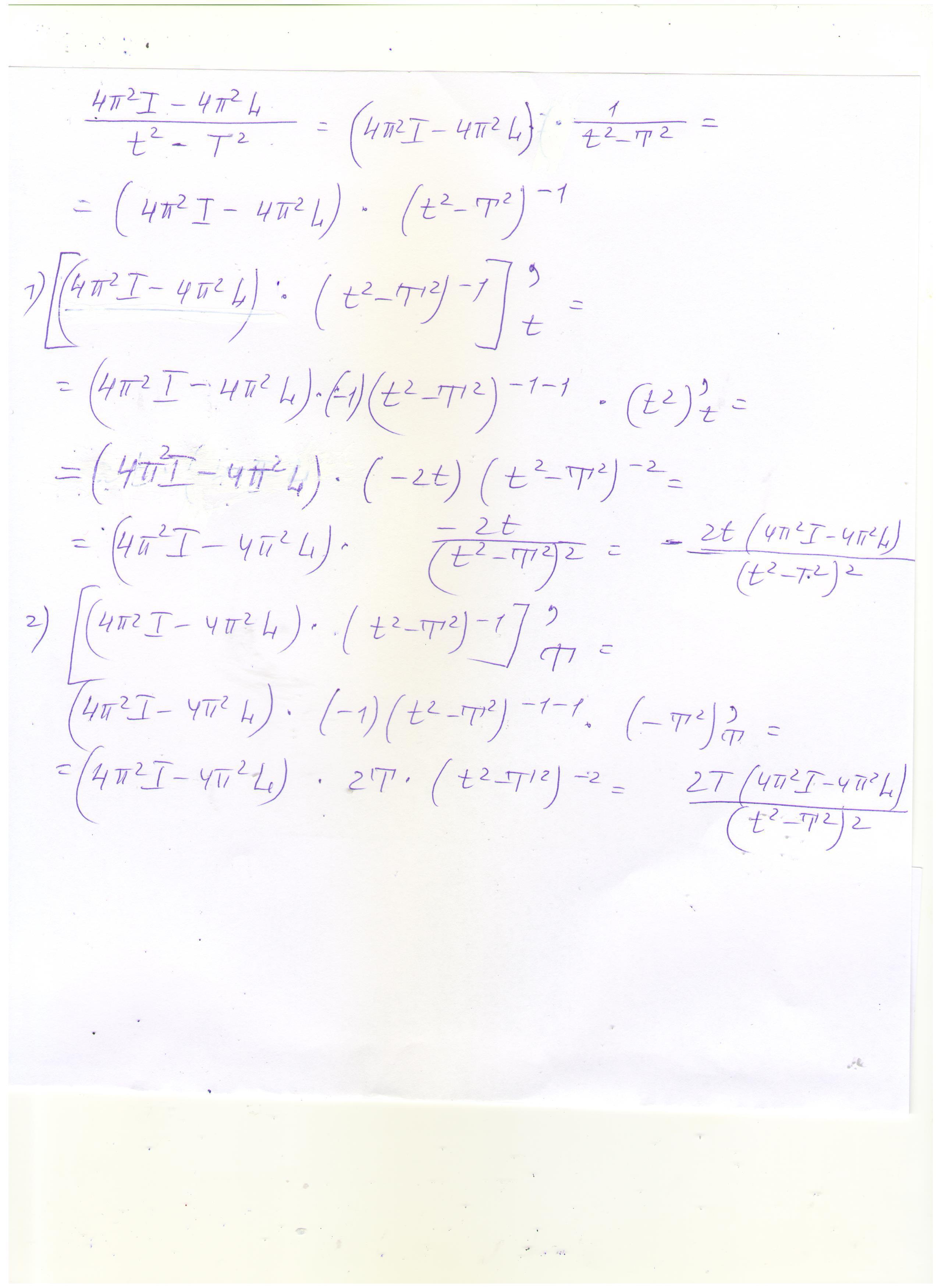 Найдите частные производные в уравнении (4(pi^2)l-4(pi^2)L)/((t^2)-T^2) по t и T. сподробными преобразованиями если не сложно.