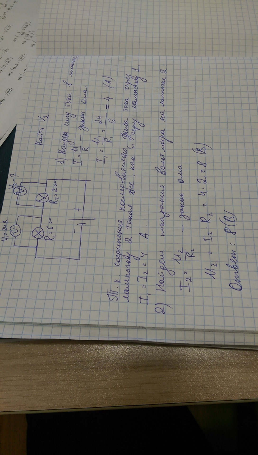 находим сначала силу тока в лампочке 1. I1=4 A. Так как соединение последовательное, сила тока I2=4. Найдем напряжение в лампочке 2. U2=8 В. В задаче работает закон Ома для участка цепи. I=U/R. Подробное решение на фото.