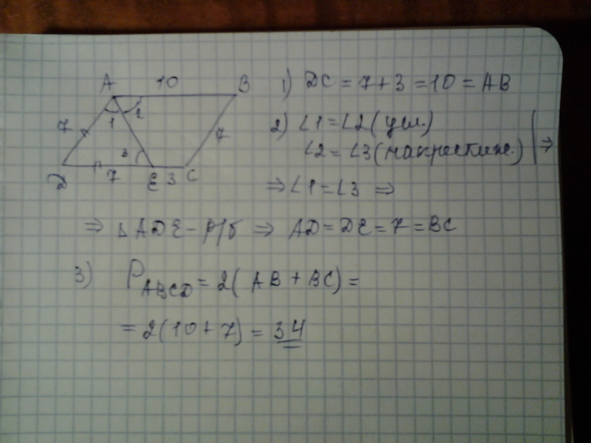 Биссектриса AE параллелограмма ABCD делит сторону BC на отрезки, равные 7 см и 3 см. Найдите периметр параллелограмма.