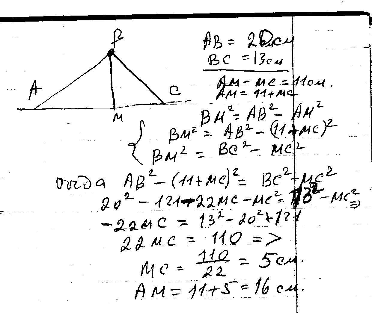 З точки В до прямої а проведені дві похилі ВА 20с і ВС 13 см. Проекція похилої ВА більше проекції ВС на 11 см .Знайдіть проекції цих похилих.