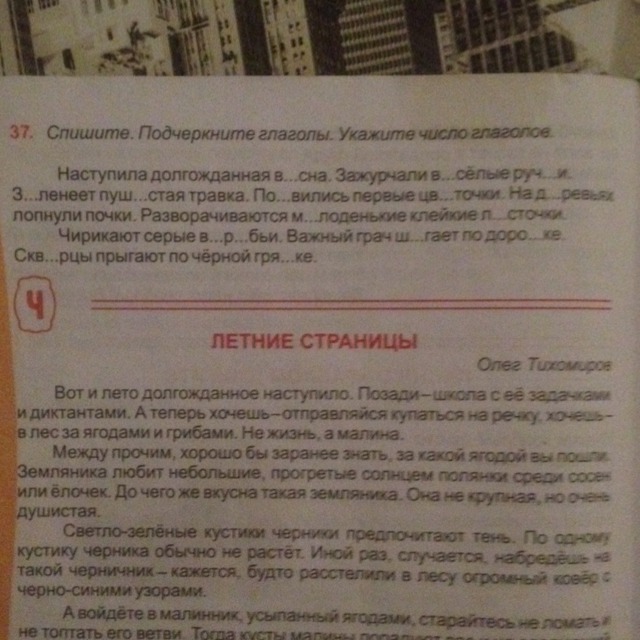 Глаголы: Наступила, зажурчали, зеленеет, появились, лопнули, разворачиваются, чирикают, шагает, прыгают.