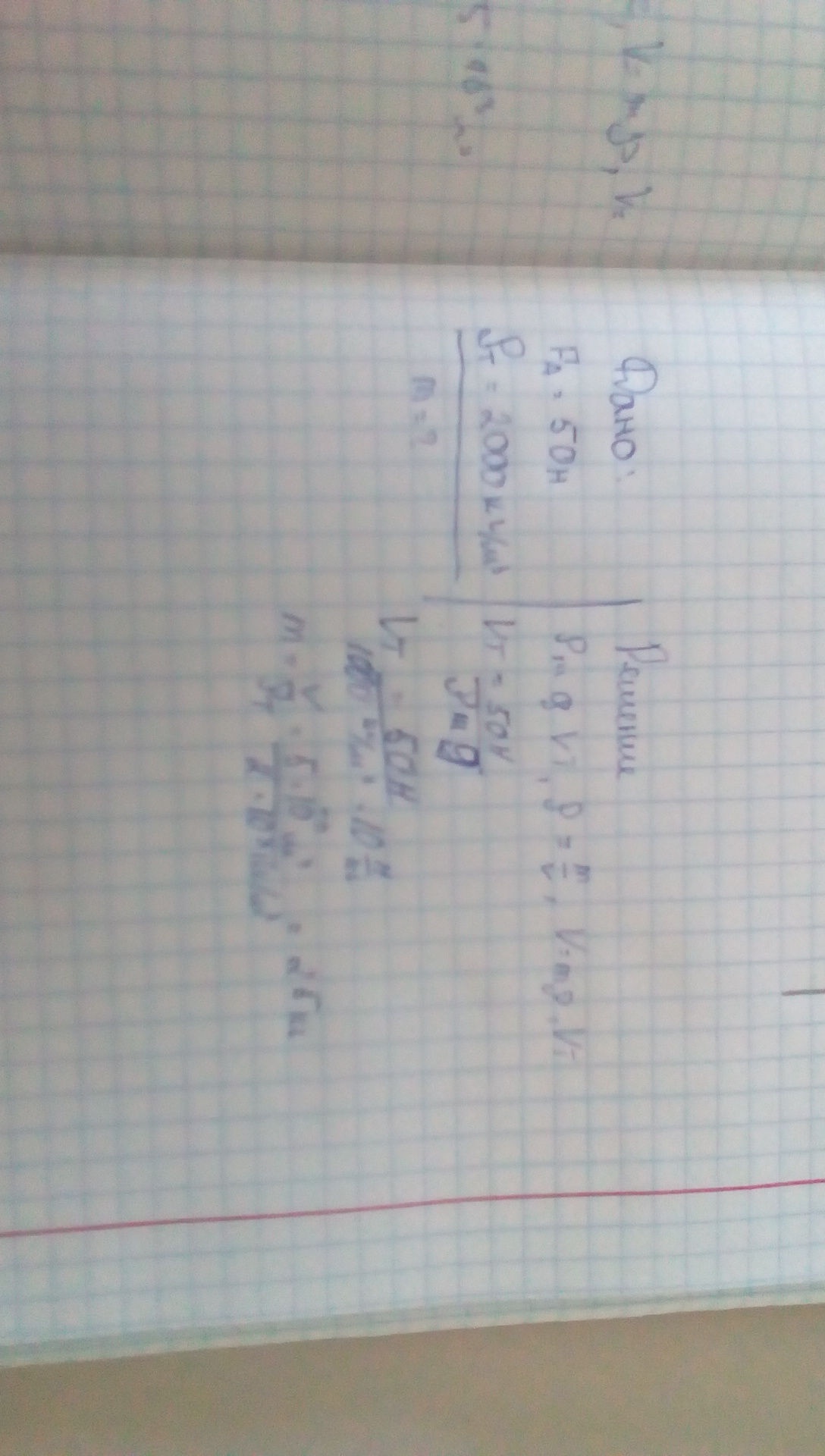 при полном погружении тела в воду вес вытесненной жидкости 50Н. чему равна масса этого тела, если его плотность 2000 кг/м3