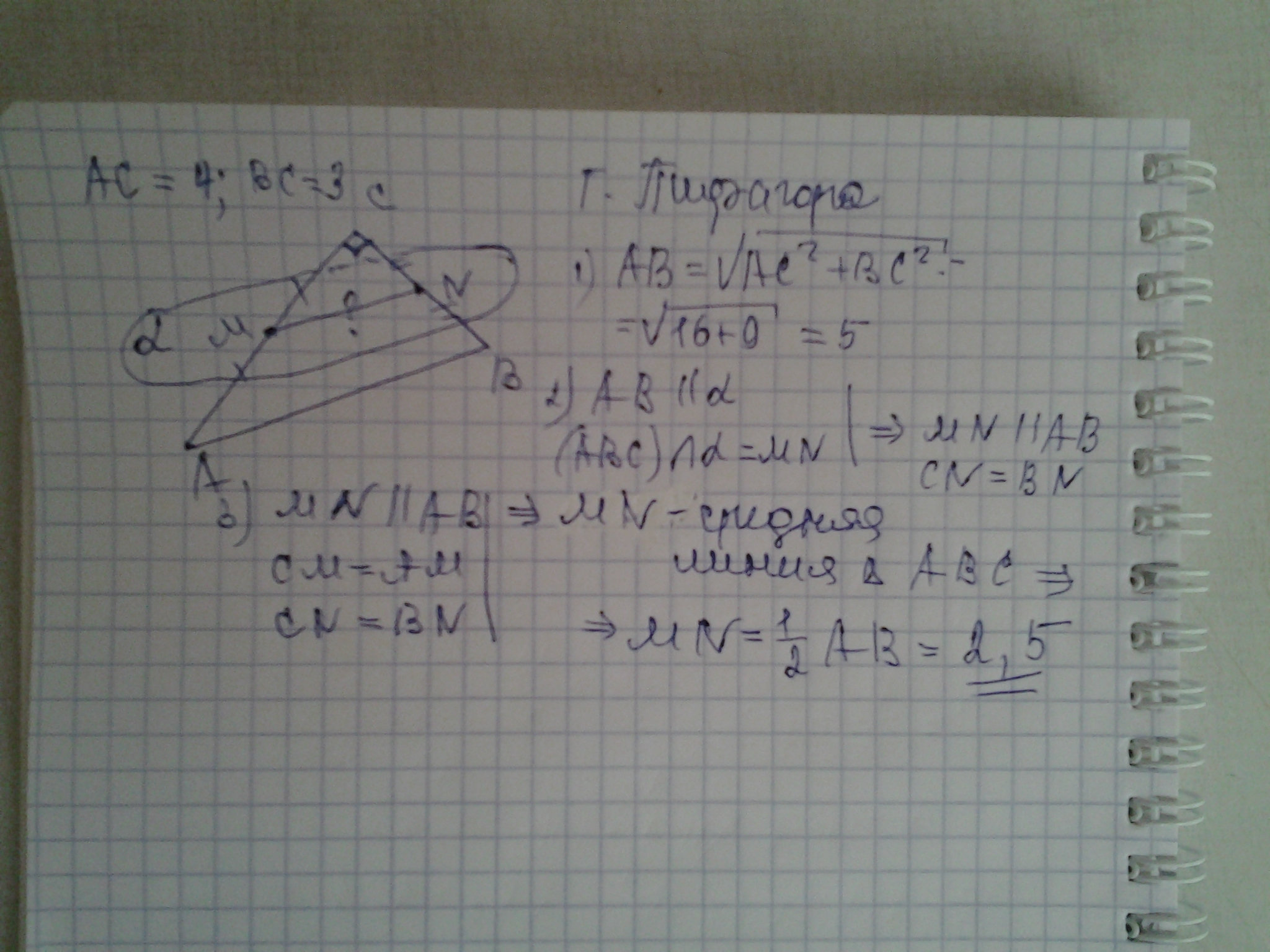 площина (альфа) паралельна гіпотенузі АВ прямокутника АВС із катетами 3 см і 4 см і перетинає катети у точках М і N. M- середина АС. Знайти відстань між точками перетину трикутника з площиною альфа.
