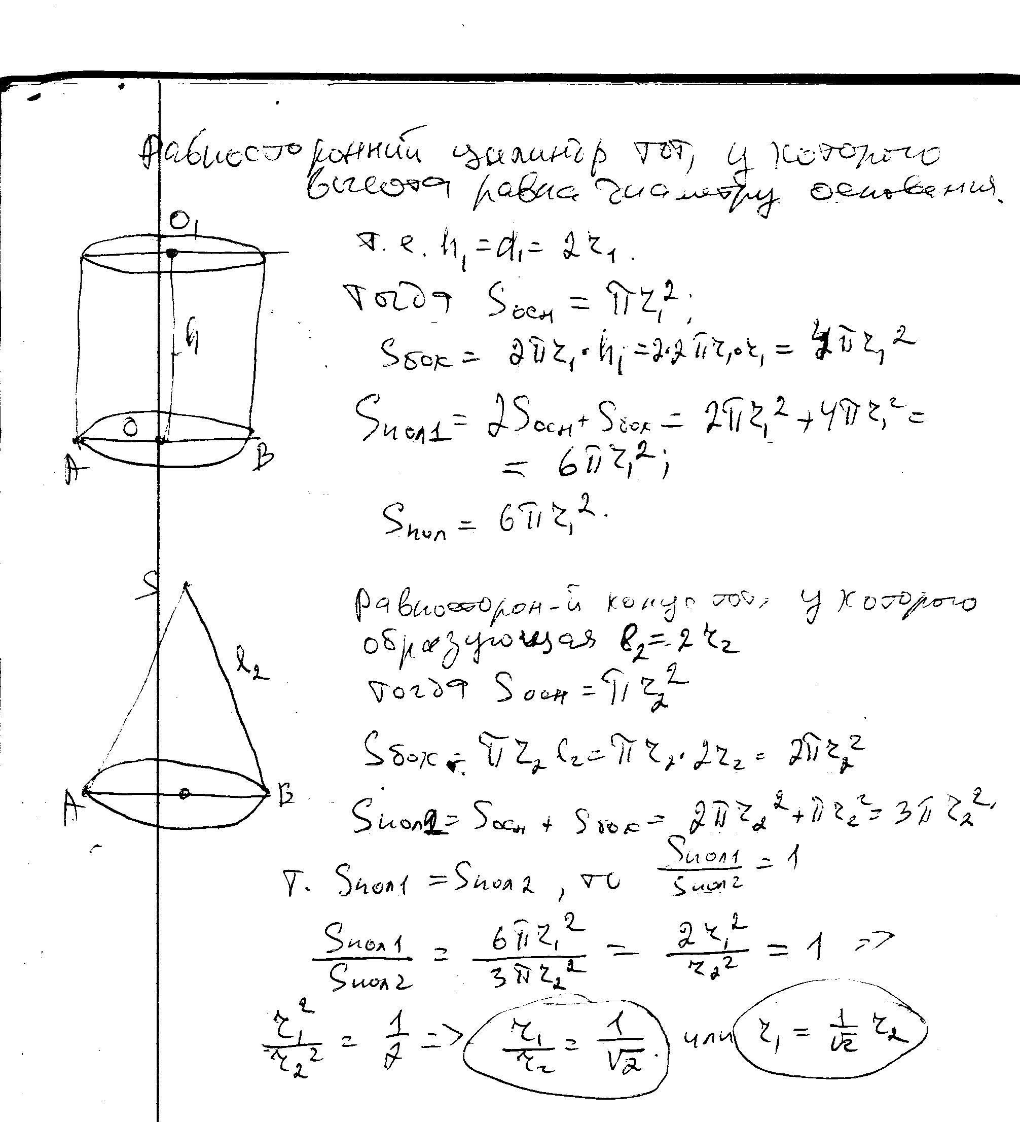 2) Площа повних поверхонь рiвностороннього конуса i рiвностороннього цилiндра рiвнi.Знайдiть вiдношення радiусiв iх основ.