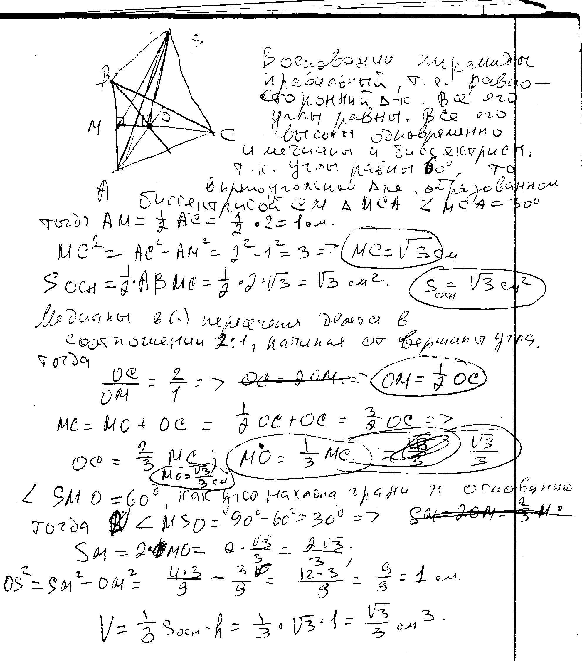 1) Усi бiчнi ребра правильноi трикутноi пiрамiди нахиленi до площi основи пiд кутом 60 градусов.Знайдiть об'ем пiрамiди,якщо сторона основи дорiвнюе 2 см.
