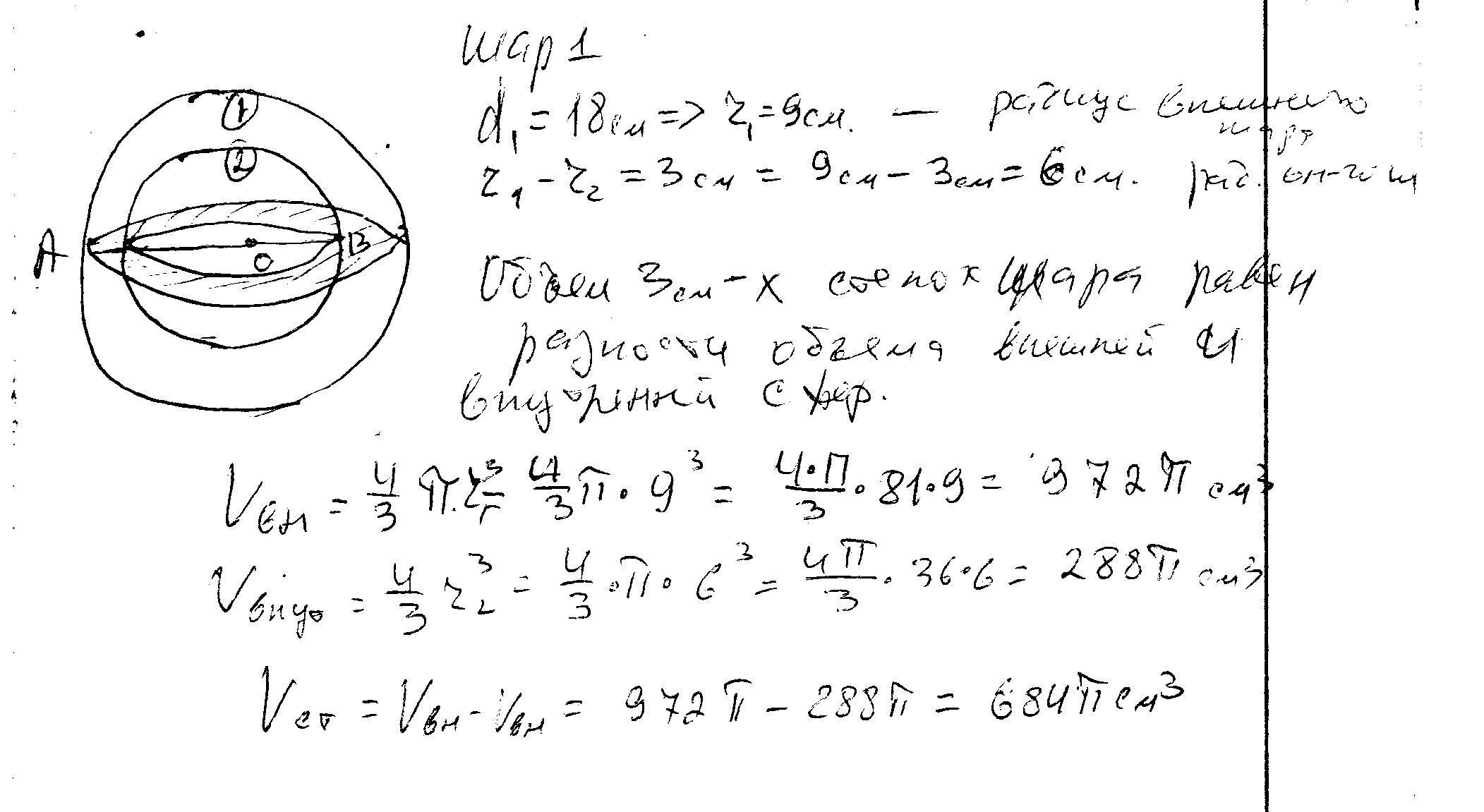 3) Зовнiшнiй дiаметр порожнистоi кулi дорiвнюе 18 см,а товщина стiнок-3 см.Знайдiть об'ем стiнок.