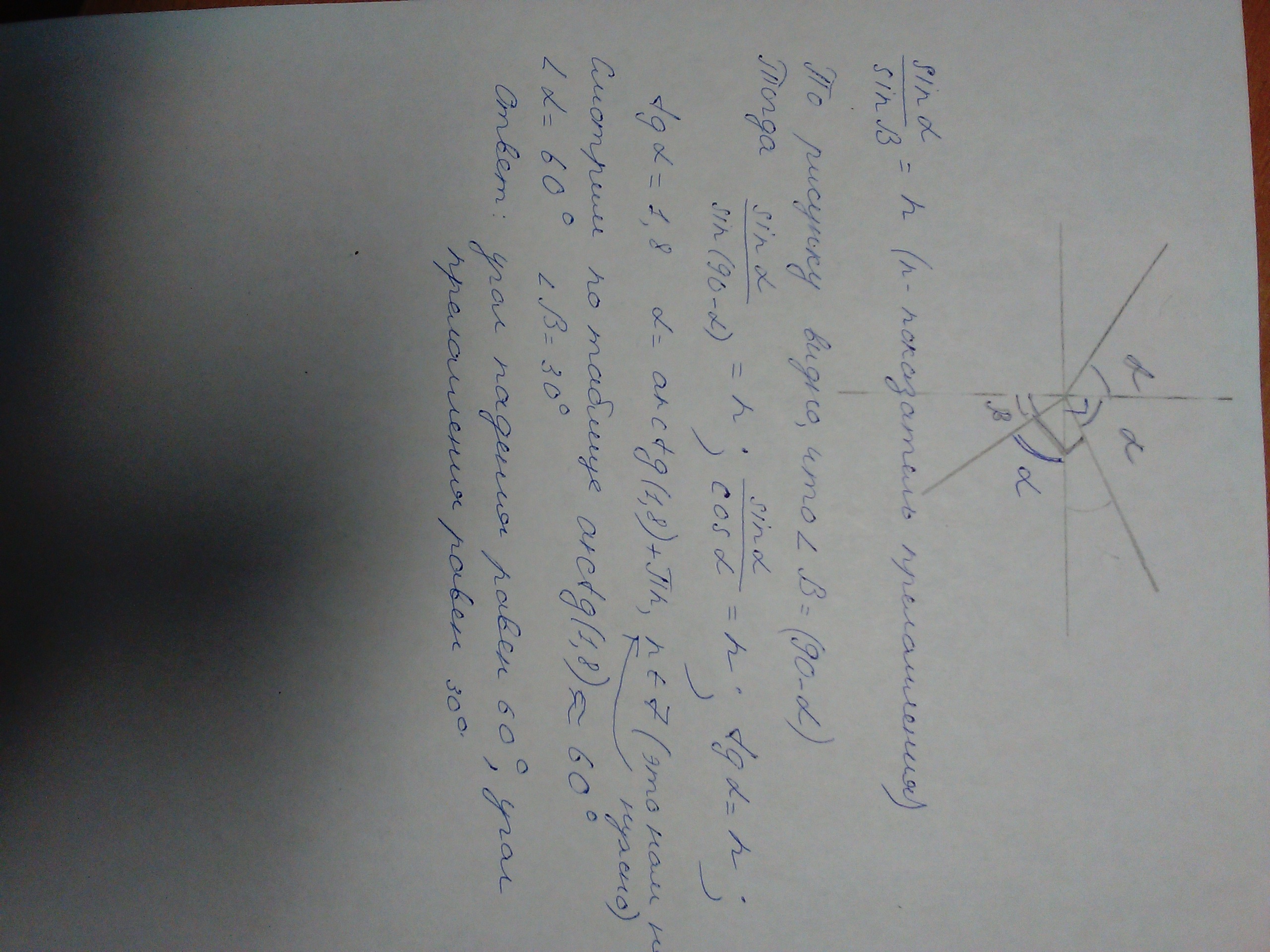 луч отраженный от поверхности стекла с показателем преломления 1,8 образует с преломленным лучом прямой угол.определите угол падения и угол преломления
