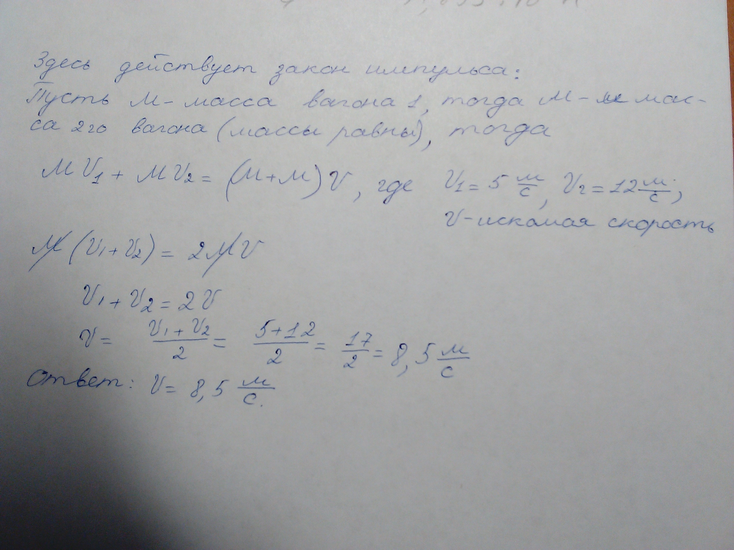 два одинаковых вагона столкнувшись соединились, продолжили совместное движение. До столкновения у них были скорости, направленные навстречу друг друга, 5м/с и 12 м/с . Каково новая скорость?