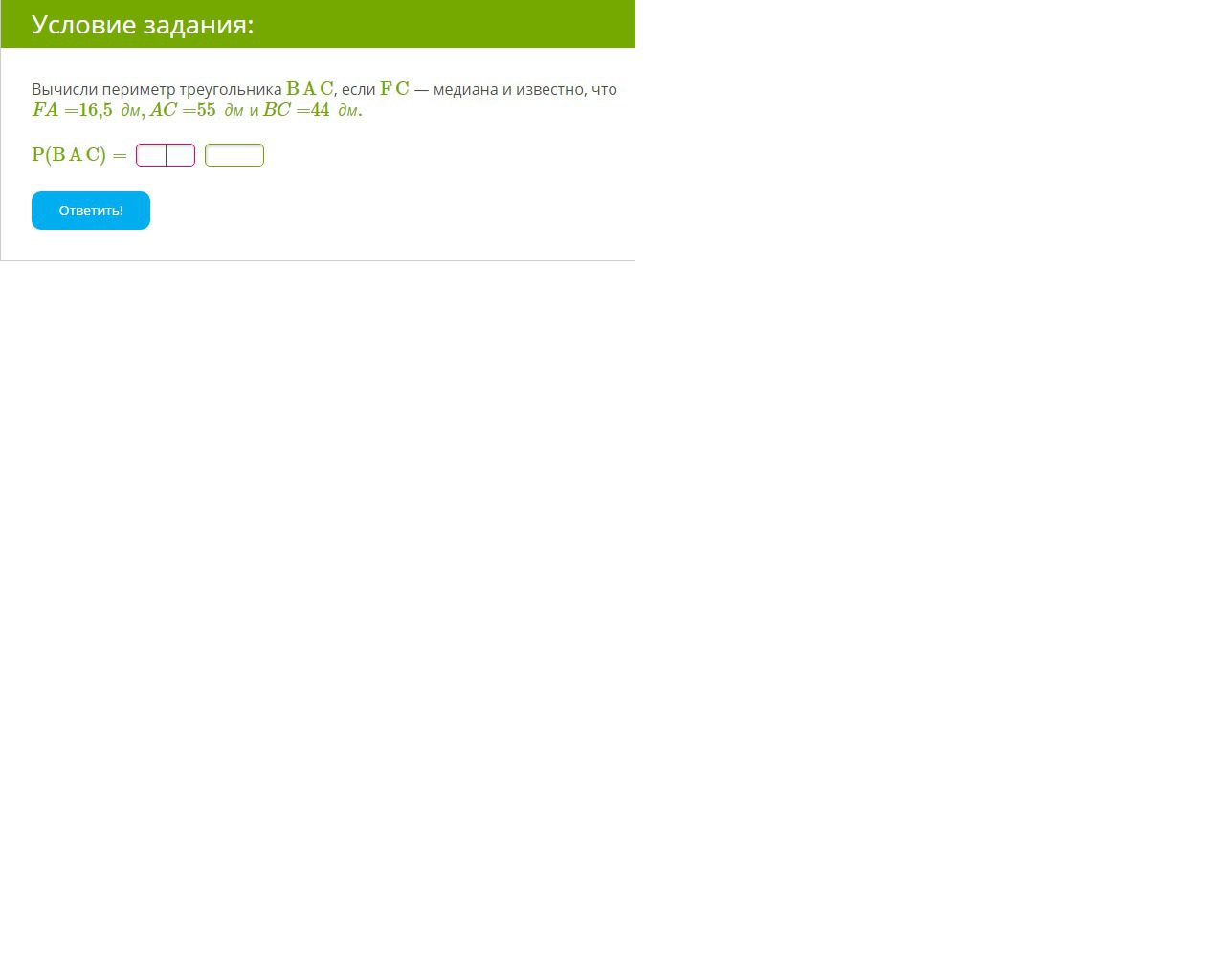 Т.к. FC- медиана,то BF=AF= 16,5 дм. Отсюда AB=16,5*2=33дм. Периметр = 33+44+55=132 дм