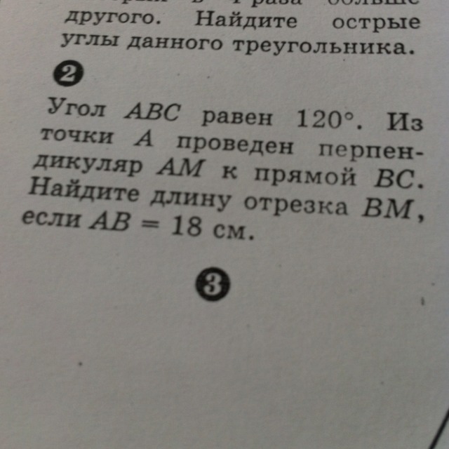 сторону ВС нужно немного продлить в сторону точки В. Т.К. АМ перпендикуляр получили прямоугольный треугольник с углом М =90. Угол АВМ =180-120=60( он смежен с углом АВС) значит угол МАВ=30. Т.к. в прямоугольном треуг-ке против угла в 30 лежит катет равный половине гипотенузы.ЗначитМВ=1/2AB=1/2*18=9