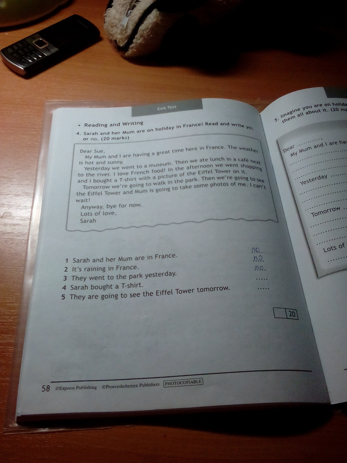 1) yes - они действительно во Франции2)no - погода жаркая, а недождливая3)no - они ходили в музей, а не в парк4)yes - она действительно купила футболку5)yes - они действительно собираются посмотреть на Эфелеву башню