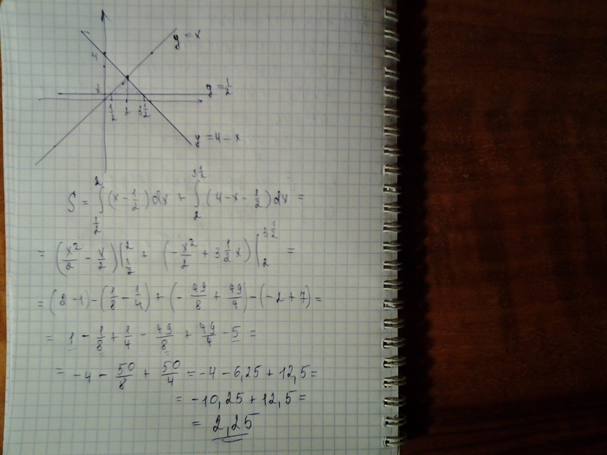 Вообще-то, можно обойтись и без интеграла. Надо найти площадь треугольника: основание равно 3 целых 1/2 - 1/2 = 3, высота равна 1 + 1/2 = 3/2. Формула площади треугольника: половина произведения осноаания на высоту. И всё! Интеграл отдыхает)))