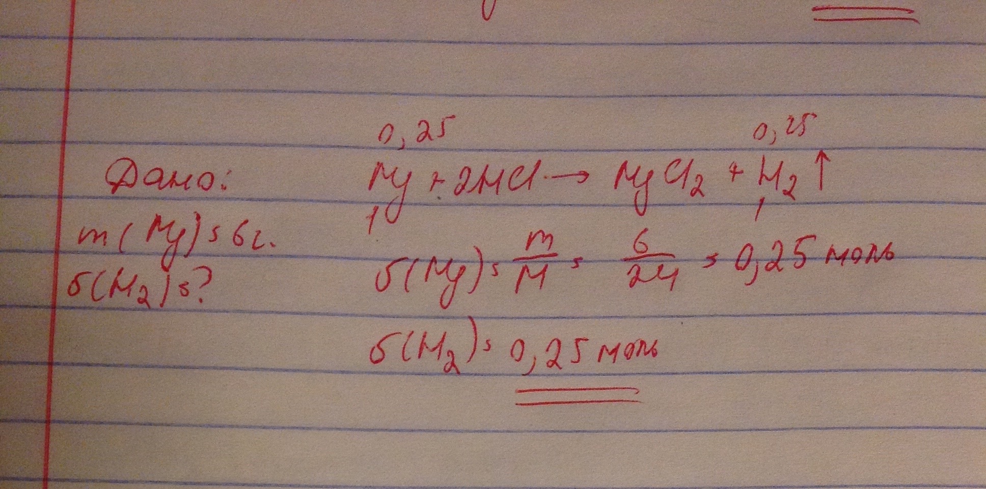 Реакция проходит по следующему уравнению Mg+2HCl=MgCl2+H2. Определить количество вещества водорода, которое образуется, если провзаемодияло 6 г магния. Помогите пожалуйста, очень нужно